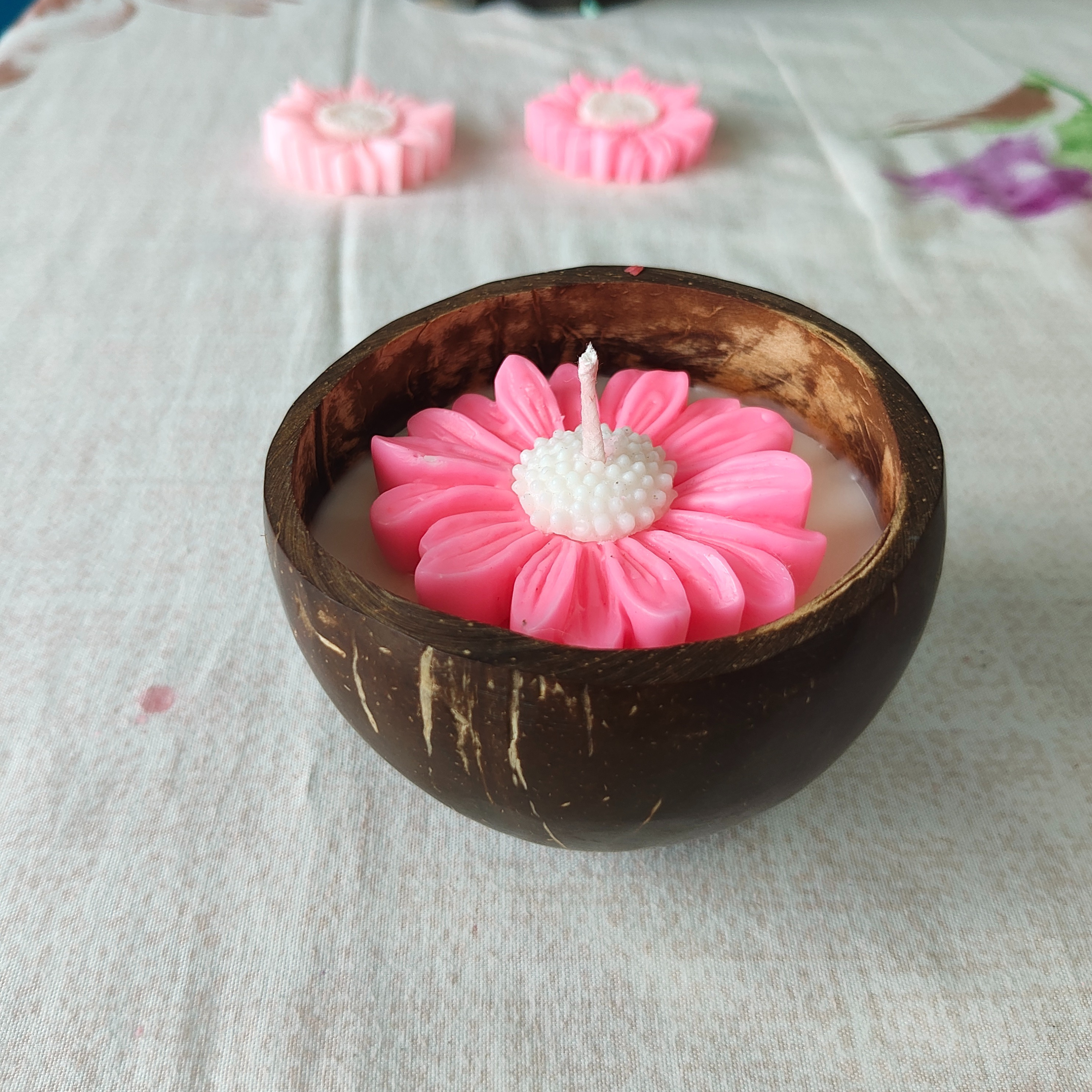 Hand-poured soy candles in real coconut shells — customizable with fragrance, color, and flowers. Eco-friendly and perfect for earthy gifts or home decor.