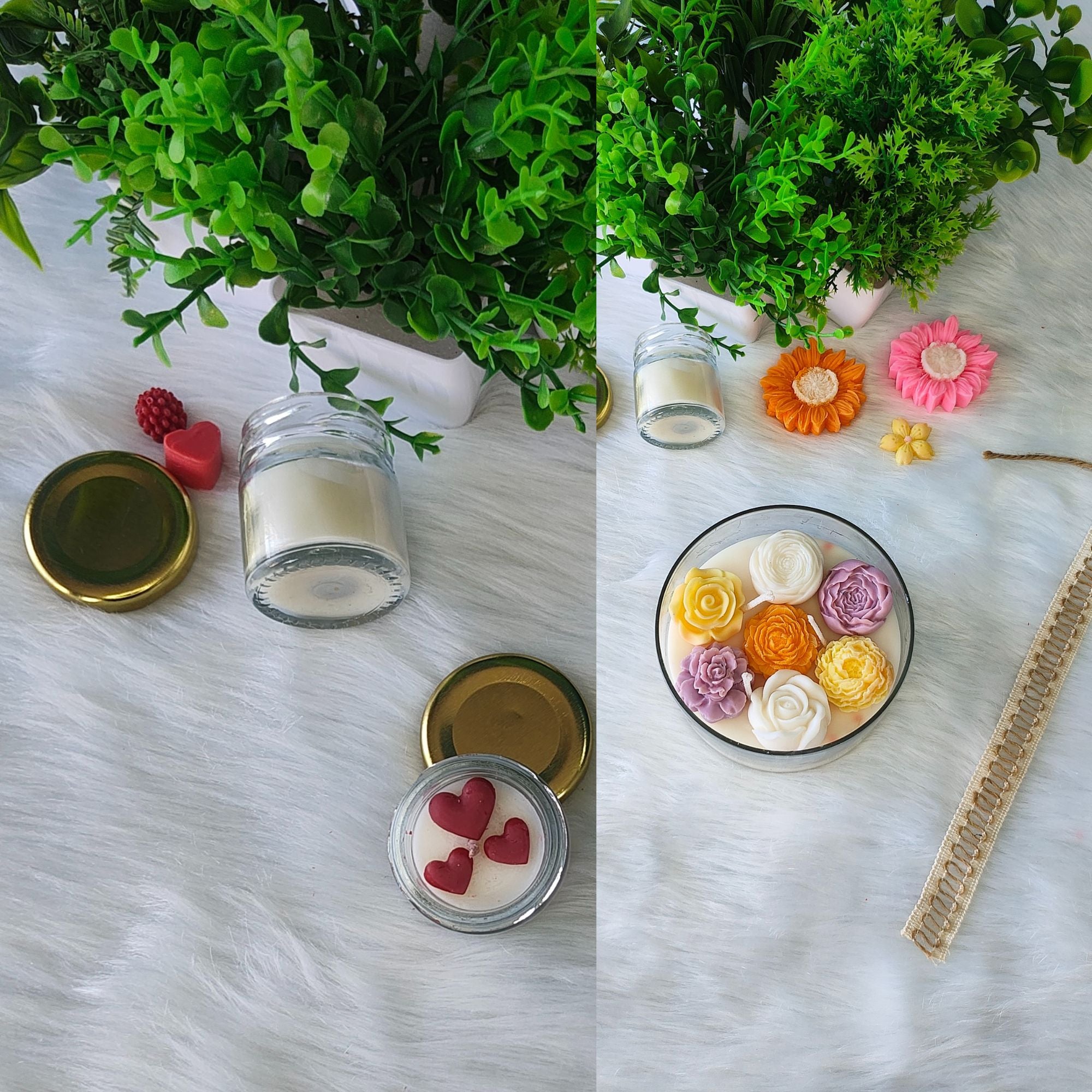 Hand poured Glass jar candles in small, medium, and large sizes—customizable with hearts flowers or roses, making them perfect return gifts.