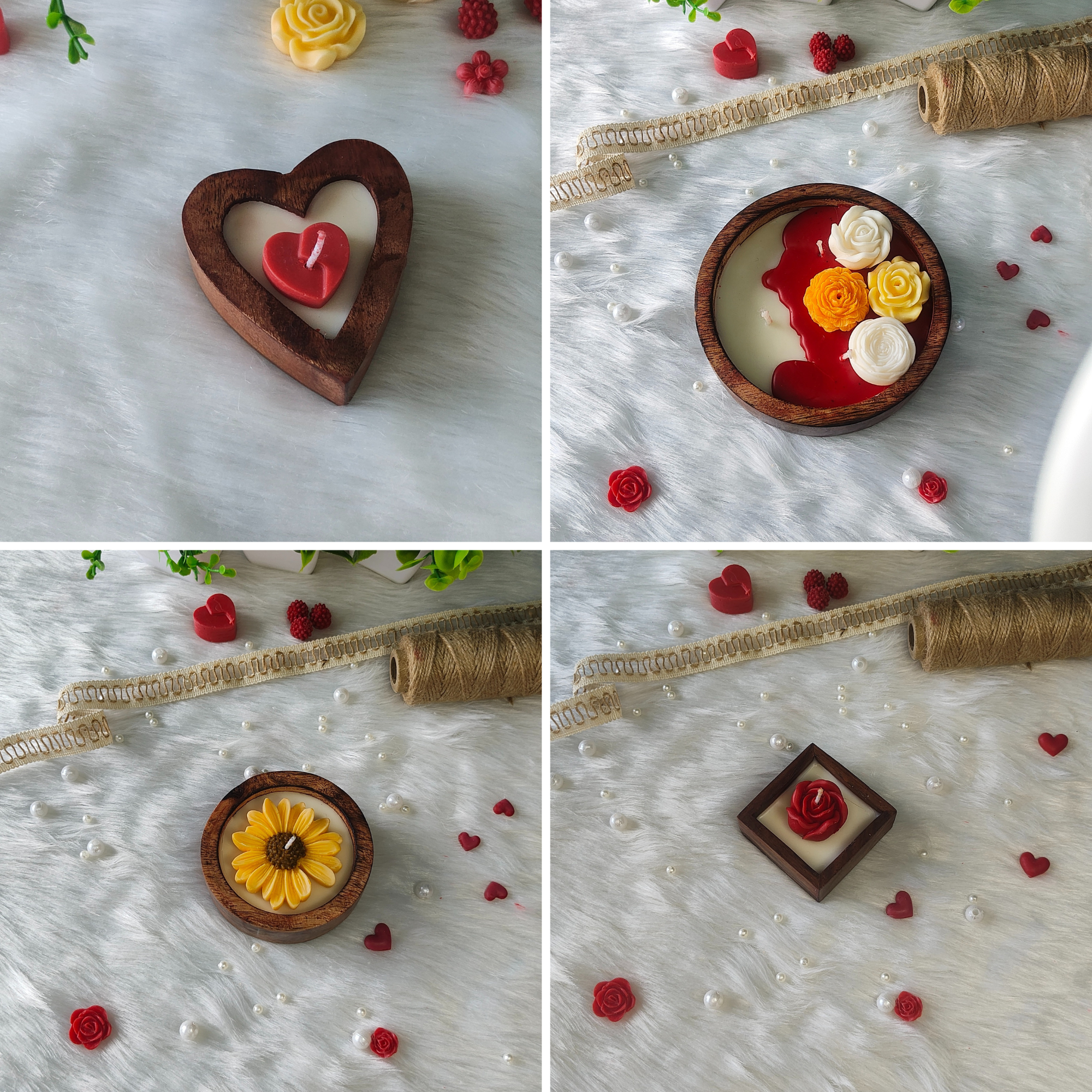 Elegant wooden candles in different shapes. Customizable with flowers and colors. Perfect for return gifts or adding a rustic charm to your space.